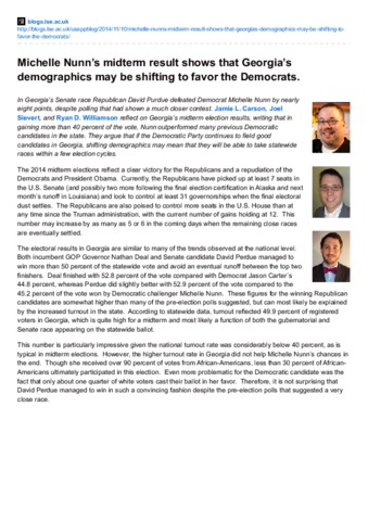 In Georgia’s Senate race Republican David Purdue defeated Democrat Michelle Nunn by nearly eight points, despite polling that had shown a much closer contest. Jamie L. Carson, Joel Sievert, and Ryan D. Williamson reflect on Georgia’s midterm election results, writing that in gaining more than 40 percent of the vote, Nunn outperformed many previous Democratic candidates in the state. They argue that if the Democratic Party continues to field good candidates in Georgia, shifting demographics may mean that they will be able to take statewide races within a few election cycles.