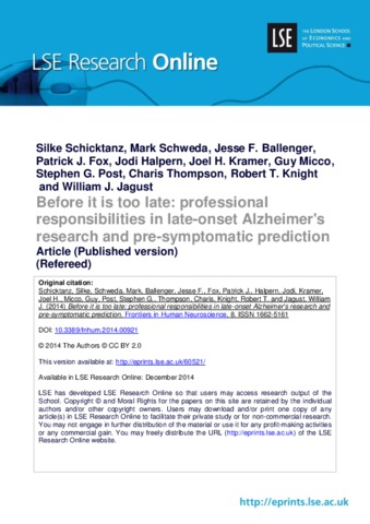 Before it is too late: professional responsibilities in late-onset Alzheimer's research and pre-symptomatic prediction