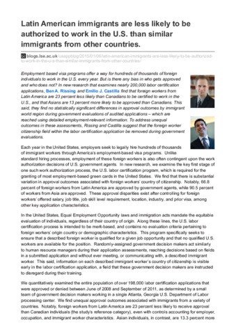 Employment based visa programs offer a way for hundreds of thousands of foreign individuals to work in the U.S. every year. But is there any bias in who gets approved and who does not? In new research that examines nearly 200,000 labor certification applications, Ben A. Rissing and Emilio J. Castilla find that foreign workers from Latin America are 23 percent less likely than Canadians to be certified to work in the U.S., and that Asians are 13 percent more likely to be approved than Canadians. This said, they find no statistically significant differences in approval outcomes by immigrant world region during government evaluations of audited applications – which are reached using detailed employment-relevant information. To address unequal outcomes in these assessments, Rissing and Castilla suggest that the foreign worker citizenship field within the labor certification application be removed during government evaluations.