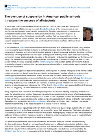 n 2010, over 3 million children were suspended from U.S. schools, with black and Latino youth disproportionately affected. In new research, Brea L. Perry looks at the consequences of what has become a widespread punishment for young adults. By using records of school suspensions and academic achievement, she finds that suspensions are used as a punitive response to negative behavior, rather than to keep schools safer, and that their use does not improve the learning environment for any students. She also finds that suspensions are particularly harmful to students’ academic achievement if they are used without restraint and in schools with lower levels of student violence.
