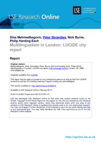 This report is produced for LUCIDE (Languages in Urban Contexts: Integration and Diversity in Europe) project and network, funded by the EU Lifelong learning programme 2010- 2014, based on the collected primary and secondary data. It includes a brief historic overview of London’s demolinguistic features and a range of evidence relevant to current manifestations of multilingualism and plurilingualism in this global city. Considering the size, population and complexity of London our specific focus is on one local authority (out of an existing 33): the City of Westminster, geographically the heart of this metropolis. Westminster is in many ways representative of London language trends. It shows some of the most prominent features of multilingualism in London: an extraordinary linguistic variety with a wide distribution of languages, where no one language is dominant. Nevertheless, we also make reference to examples of multilingualism from outside Westminster, when we have considered it to be pertinent.