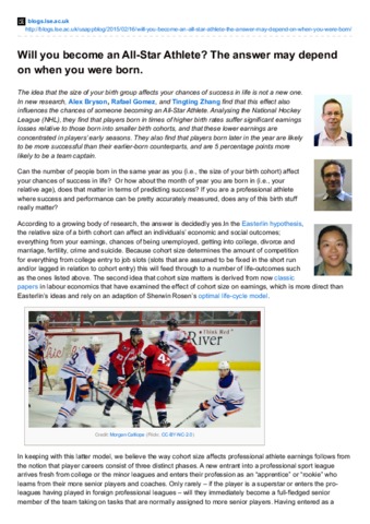 The idea that the size of your birth group affects your chances of success in life is not a new one. In new research, Alex Bryson, Rafael Gomez, and Tingting Zhang find that this effect also influences the chances of someone becoming an All-Star Athlete. Analysing the National Hockey League (NHL), they find that players born in times of higher birth rates suffer significant earnings losses relative to those born into smaller birth cohorts, and that these lower earnings are concentrated in players’ early seasons. They also find that players born later in the year are likely to be more successful than their earlier-born counterparts, and are 5 percentage points more likely to be a team captain.