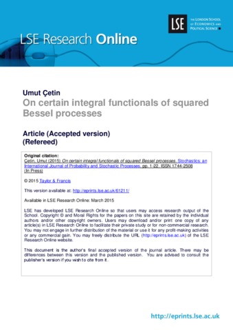 | Keywords | Bessel processes,modified Bessel functions,first passage times,small deviations,Chung's law of iterated logarithm,non-homogeneous Feller jump process,time reversal,last passage times,subordinator,interest rate derivatives |