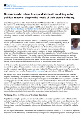 One of the key provisions of the Patient Protection and Affordable Care Act, or ‘Obamacare’ was the expansion of Medicaid program across the states. The Supreme Court struck down the requirement for states to expand the program in 2012, and 20 states have since opted out. In new research, Charles Barrilleaux and Carlisle Rainey look at why state government have opted out of the Medicaid expansion. They find that political variables, such as Obama’s 2012 vote share and the governor’s partisanship are the best predictors of opposition to Medicaid expansion, rather than measures of need, such as life expectancy or the number of people that are uninsured.