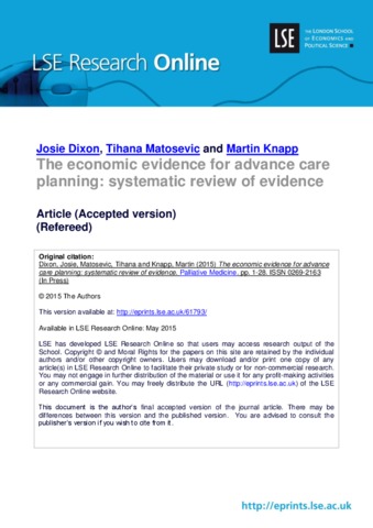 The economic evidence for advance care planning: systematic review of evidence