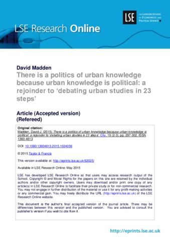 There is a politics of urban knowledge because urban knowledge is political: a rejoinder to ‘debating urban studies in 23 steps’.
