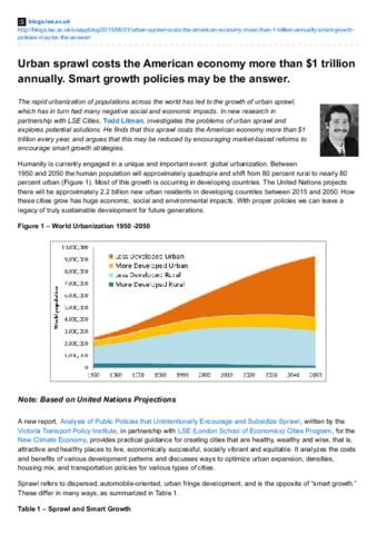 The rapid urbanization of populations across the world has led to the growth of urban sprawl, which has in turn had many negative social and economic impacts. In new research in partnership with LSE Cities, Todd Litman, investigates the problems of urban sprawl and explores potential solutions. He finds that this sprawl costs the American economy more than $1 trillion every year, and argues that this may be reduced by encouraging market-based reforms to encourage smart growth strategies.