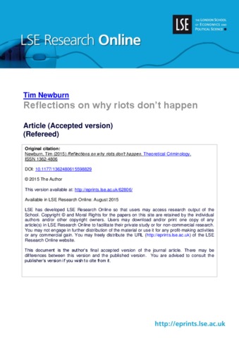 In contrast to much of the literature in the field of public disorder, rather than focusing on the nature and aetiology of riots, in this paper I investigate why riots don’t happen. During times of widespread disorder there are some locations that, whilst apparently sharing many of the features of the places where significant disorder is occurring, do not fall prey to rioting themselves. Why? Against the backdrop of the 2011 England riots – though the arguments developed here have international application - I use two case studies involving semi-structured interviews with key informants in two such locations to reflect on why riots don’t happen. Initially drawing on Waddington’s ‘flashpoints’ model, I argue that it was primarily matters at an interactional level that appear to have been crucial in the absence of riots in these particular cases. In order to facilitate a more detailed analysis at this level in particular, I propose some elaboration of the flashpoints approach, using Reicher’s ‘social identity’ model, as the basis understanding the nature of police-crowd and police-community interaction.