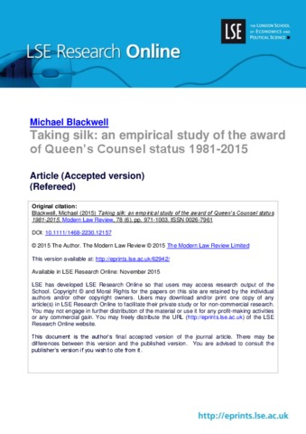 Taking silk: an empirical study of the award of Queen’s Counsel status 1981-2015