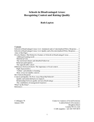 Both educational attainment and school quality are typically lower in disadvantaged areas than others and much recent policy attention has been focused on each. This paper looks at the quality problem, exploring the relationships between disadvantaged contexts, what schools do, and the quality of schooling that they provide. The findings suggest that disadvantaged contexts impact on the organisation and processes of schools and that these effects differ significantly from one area to another, in ways that are not reflected by the usual indicators of disadvantage. School managers respond by adapting organisational design and processes. They are, however, constrained in these responses by the limited and short-life funding available, by the lack of evidence of good practice in specific contexts, and by lack of flexibility over major issues of organisation design and curriculum. Challenging contexts and the constraints on school responses together exert a downward pressure on quality. The paper argues that because school processes and quality are affected by context, school improvement in disadvantaged areas will not be achieved by generic measures, but only by policies tailored to disadvantaged areas and sensitive to differences between these areas. It suggests ways in which school improvement policies could be contextualised in order to raise quality in the poorest areas.