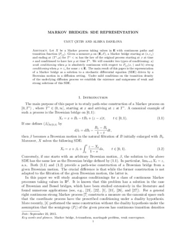 Let X be a Markov process taking values in E with continuous paths and transition function (Ps,t).Given a measureμon(E,E), a Markov bridge starting at(s,εx)and ending at (T∗,μ) for T∗<∞ has the law of the original process starting at x at times and conditioned to have law μ at time T∗. We will consider two types of conditioning: (a)weak conditioning when μ is absolutely continuous with respect to Ps,t(x,·)and (b)strong conditioning when μ=εz for some z∈E. The main result of this paper is the representation of a Markov bridge as a solution to a stochastic differential equation (SDE) driven by a Brownian motion in a diffusion setting. Under mild conditions on the transition density of the underlying diffusion process we establish the existence and uniqueness of weak and strong solutions of this SDE