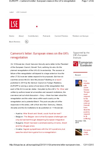 On 10 November, David Cameron formally sent a letter to the President of the European Council, Donald Tusk, outlining his aims for the planned renegotiation of the UK’s EU membership. The success or failure of the renegotiation will depend to a large extent on how the other 27 EU member states respond to his proposals. But how do countries across the EU view the process? Building on a report published in 2014 by the German Council on Foreign Relations, EUROPP is running a series of overviews of the renegotiation from each of the EU’s member states. Compiled by the LSE’s Tim Oliver and written by authors based at universities and research institutions, the overviews set out what discussion – if any – there has been about the renegotiation and the wider views within each country on the renegotiation and a potential Brexit. This post compiles all of the responses in the series, with a final view from Germany, Greece, Slovakia and the EU institutions to be published on 11 November.