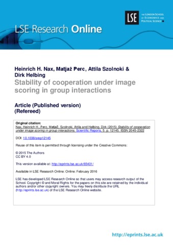 Image scoring sustains cooperation in the repeated two-player prisoner’s dilemma through indirect reciprocity, even though defection is the uniquely dominant selfish behaviour in the one-shot game. Many real-world dilemma situations, however, firstly, take place in groups and, secondly, lack the necessary transparency to inform subjects reliably of others’ individual past actions. Instead, there is revelation of information regarding groups, which allows for ‘group scoring’ but not for image scoring. Here, we study how sensitive the positive results related to image scoring are to information based on group scoring. We combine analytic results and computer simulations to specify the conditions for the emergence of cooperation. We show that under pure group scoring, that is, under the complete absence of image-scoring information, cooperation is unsustainable. Away from this extreme case, however, the necessary degree of image scoring relative to group scoring depends on the population size and is generally very small. We thus conclude that the positive results based on image scoring apply to a much broader range of informational settings that are relevant in the real world than previously assumed.