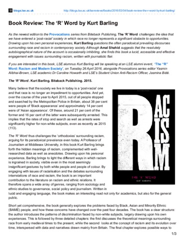 As the newest edition to the Provocations series from Biteback Publishing, The ‘R’ Word challenges the idea that we have entered a ‘post-racial’ society in which race no longer represents a significant obstacle to opportunities. Drawing upon his own personal experiences, Kurt Barling questions the often paradoxical prevailing discourses surrounding race and racism in contemporary society. Although Amal Shahid suggests that the resolutely autobiographical nature of the account is occasionally inhibiting, she finds this book a lucid, accessible and effective engagement with issues surrounding racism, written with journalistic flair.