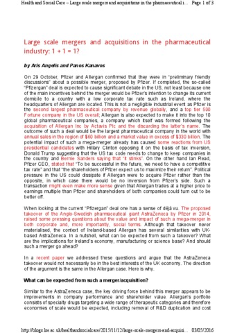 Large scale mergers and acquisitions in the pharmaceutical industry: 1 + 1 = 1?