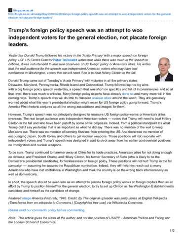 - http://blogs.lse.ac.uk/usappblog/2016/04/28/trumps-foreign-policy-speech-was-an-attempt-to-woo-independent-voters-for-the-general-election-not-placate-foreign-leaders/ (Publisher)