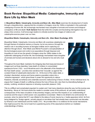 Book review: Biopolitical media: catastrophe, immunity and bare life by Allen Meek.