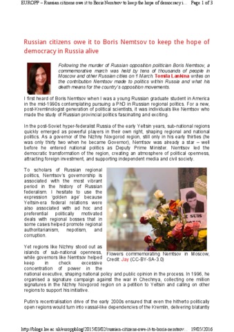 Following the murder of Russian opposition politician Boris Nemtsov, a commemorative march was held by tens of thousands of people in Moscow and other Russian cities on 1 March. Tomila Lankina writes on the contribution Nemtsov made to politics within Russia and what his death means for the country’s opposition movements.