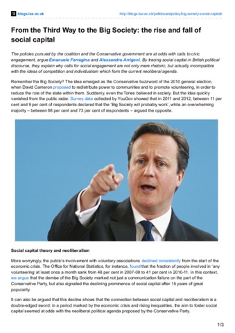 The policies pursued by the coalition and the Conservative government are at odds with calls to civic engagement, argue Emanuele Ferragina and Alessandro Arrigoni. By tracing social capital in British political discourse, they explain why calls for social engagement are not only mere rhetoric, but actually incompatible with the ideas of competition and individualism which form the current neoliberal agenda.