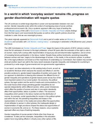 The UK continues to exhibit large disparities in power and representation between men and women. Gender inequality exists within the context of overlapping areas of social, political, professional and economic life. Only a systemic approach offers any hope of tackling the issue. Nicola Lacey of the LSE’s Commission on Gender, Inequality and Power shares findings from the final report, and recommends that quotas as well as other specific policies should be instituted in order that we see meaningful process.