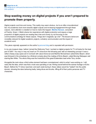 Digital projects cost time and money. This reality may seem obvious, but is an often misunderstood fact. As academics look more towards digital outputs and increasing engagement through these outputs, more attention is needed on how to make this happen. Martha Henson, consultant at Frankly, Green + Webb shares her experience with digital production and argues a large proportion of digital projects are wasting their time and money by not focusing on the communications strategy for these outputs. Things don’t magically “go viral”. The lessons below are incredibly relevant for digital academic projects, scholarly communication and the impact of academic work.