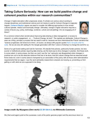 Change in higher education often progresses slowly. If scholars are serious about wanting to change disciplinary and institutional cultures and not merely to wait for Cultural Change to magically happen, Cameron Neylon argues we need to consider the differing approaches to how certain cultures operate, interact and eventually change. Ultimately, change in higher education requires a variety of levers (e.g. policy, technology, evidence, culture and storytelling). Are we engaging all of these?