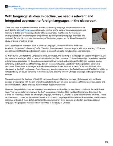 There has been a rapid decline in the number of university language departments since the early 2000s. Michael Tavares provides wider context on the state of language teaching and learning in Britain and looks in particular at how universities might boost the relevance of language studies in other degree programmes. By incorporating language exercises and materials for specific purposes, the teaching of foreign languages can be filtered through the study of a host of subject areas.