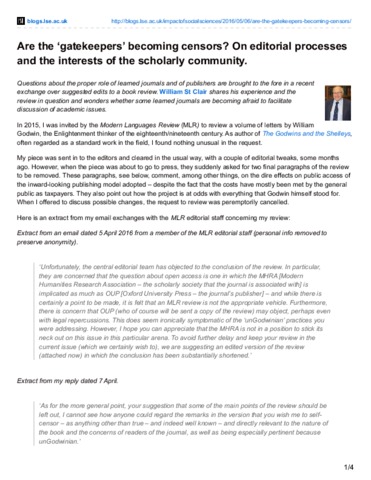 Questions about the proper role of learned journals and of publishers are brought to the fore in a recent exchange over suggested edits to a book review. William St Clair shares his experience and the review in question and wonders whether some learned journals are becoming afraid to facilitate discussion of academic issues.