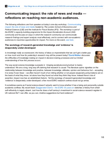 The following reflections are from speakers at today’s one-day workshop, Communicating impact: the role of news and media hosted by The London School of Economics and Political Science (LSE) and the Institute for Fiscal Studies (IFS). The workshop is part of the ESRC’s capacity-building programme for the Impact Acceleration Account (IAA) community and focuses on ways in which the research community can communicate research findings and expert analysis most effectively, and to connect with non-academic audiences to maximise opportunities for impact. For more on the event, see here.