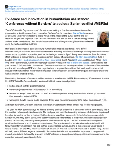 Evidence and innovation in humanitarian assistance: ‘Conference without Borders’ to address Syrian conflict #MSFSci