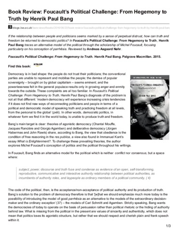 Book review: Foucault’s political challenge: from hegemony to truth by Henrik Paul Bang