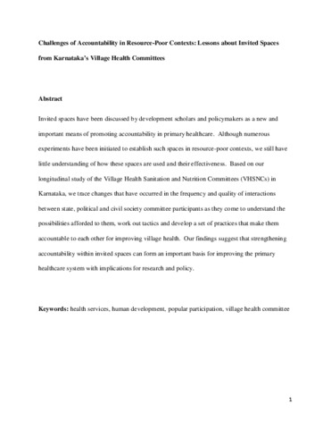 Challenges of accountability in resource-poor contexts:lessons about invited spaces from Karnataka’s village health committees