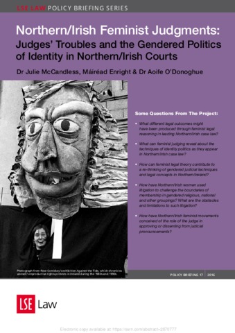 • What different legal outcomes might have been produced through feminist legal reasoning in leading Northern/Irish case law? • What can feminist judging reveal about the techniques of identity politics as they appear in Northern/Irish case law? • How can feminist legal theory contribute to a re-thinking of gendered judicial techniques and legal concepts in Northern/Ireland? • How have Northern/Irish women used litigation to challenge the boundaries of membership in gendered religious, national and other groupings? What are the obstacles and limitations to such litigation? • How have Northern/Irish feminist movements conceived of the role of the judge in approving or dissenting from judicial pronouncements?