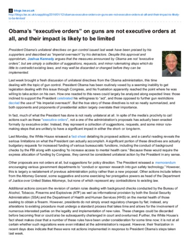 President Obama’s unilateral directives on gun control issued last week have been praised by his supporters and described as “imperial overreach” by his detractors. Despite this approval and opprobrium, Joshua Kennedy argues that the measures announced by Obama are not “executive orders”, but are simply a collection of suggestions, requests, and minor rulemaking steps which do little to contradict existing laws, and may well be discarded or changed before they can be implemented.