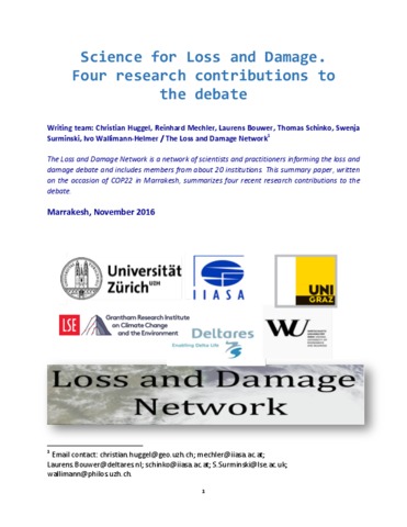 The Loss and Damage Network is a network of scientists and practitioners informing the loss and damage debate and includes members from about 20 institutions. This summary paper, written on the occasion of COP22 in Marrakesh, summarizes four recent research contributions to the debate.