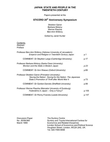 Japan: state and people in the twentieth century - papers presented at the STICERD 20th anniversary symposium in July 1998