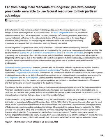 Far from being mere ‘servants of Congress’, pre-20th century presidents were able to use federal resources to their partisan advantage