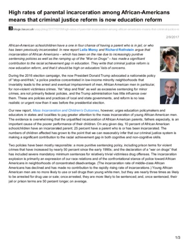 African-American schoolchildren have a one in four chance of having a parent who is in jail, or who has been previously incarcerated. In new report Leila Morsy and Richard Rothstein argue that incarceration of African Americans – which has been on the rise due to increasingly punitive sentencing policies as well as the ramping up of the “War on Drugs” – has made a significant contribution to the racial achievement gap in education. They write that criminal justice reform is now education reform, and that it should be high on educators’ lists of concerns.