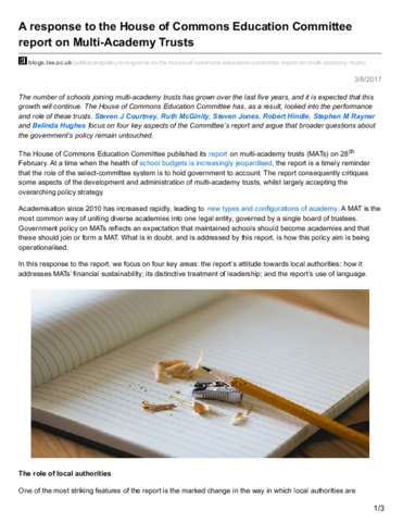 A response to the House of Commons Education Committee report on Multi-Academy Trusts