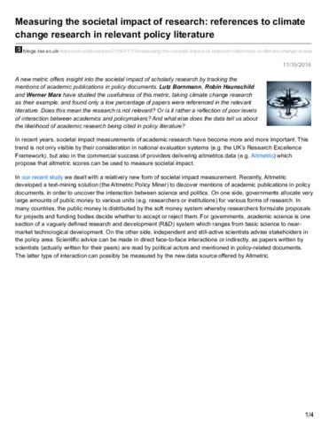 A new metric offers insight into the societal impact of scholarly research by tracking the mentions of academic publications in policy documents. Lutz Bornmann, Robin Haunschild and Werner Marx have studied the usefulness of this metric, taking climate change research as their example, and found only a low percentage of papers were referenced in the relevant literature. Does this mean the research is not relevant? Or is it rather a reflection of poor levels of interaction between academics and policymakers? And what else does the data tell us about the likelihood of academic research being cited in policy literature?