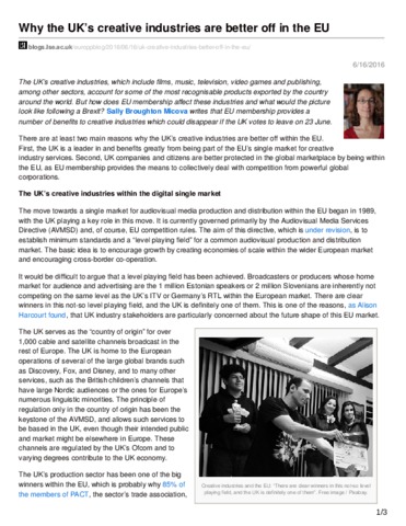 The UK’s creative industries, which include films, music, television, video games and publishing, among other sectors, account for some of the most recognisable products exported by the country around the world. But how does EU membership affect these industries and what would the picture look like following a Brexit? Sally Broughton Micova writes that EU membership provides a number of benefits to creative industries which could disappear if the UK votes to leave on 23 June.