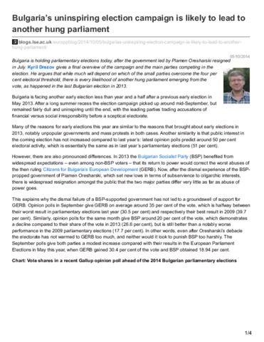 Bulgaria is holding parliamentary elections today, after the government led by Plamen Oresharski resigned in July. Kyril Drezov gives a final overview of the campaign and the main parties competing in the election. He argues that while much will depend on which of the small parties overcome the four per cent electoral threshold, there is every likelihood of another hung parliament emerging from the vote, as happened in the last Bulgarian election in 2013.