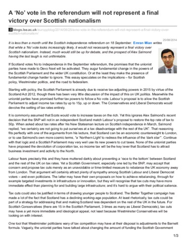 It is less than a month until the Scottish independence referendum on 18 September. Emran Mian writes that while a ‘No’ vote looks increasingly likely, it would not necessarily represent a final victory over Scottish nationalism. Instead, much would still be up for debate, and the prospect of Alex Salmond having the last laugh is not unthinkable.