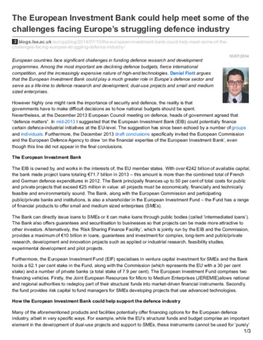 European countries face significant challenges in funding defence research and development programmes. Among the most important are declining defence budgets, fierce international competition, and the increasingly expensive nature of high-end technologies. Daniel Fiott argues that the European Investment Bank could play a much greater role in Europe’s defence sector and serve as a life-line to defence research and development, dual-use projects and small and medium sized enterprises.