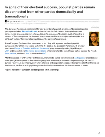 In spite of their electoral success, populist parties remain disconnected from other parties domestically and transnationally