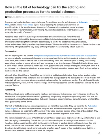Academic text production faces many challenges. Some of them are of a technical nature. Johannes Wilm, initiator behind Fidus Writer, argues that by adapting the text editing environment for scientific articles in the social sciences, the amount of manual labour going into journal and book production can be cut dramatically while making the product accessible to a wider audience, and enhancing the quality of research.
