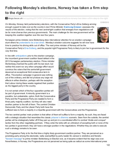On Monday, Norway held parliamentary elections, with the Conservative Party’s Erna Solberg winning enough support to take over as the country’s next Prime Minister. Sveinung Arnesen assesses the results of the election, noting that the new centre/right coalition that emerges from negotiations will be far more diverse than previous governments. The main challenge for the new government will be keeping this coalition together over the next four years.