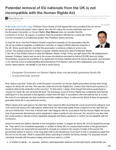 In an earlier post on this blog, Professor Conor Gearty of LSE argued that even post-Brexit the UK will not be able to remove European Union citizens from the UK unless the country withdraws also from the European Convention on Human Rights. Paul Skinner does not consider that this conclusion is correct. He argues, in essence, that the protection afforded by, in particular, Article 8 of the Convention is considerably weaker than Professor Gearty assumes.