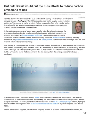 Too little attention has been paid to the EU’s contribution to tackling climate change by referendum campaigners, says Tim Rayner. The UK has played a major part in shaping carbon reduction policies and has pushed for higher targets in the face of opposition from other member states. If we left the EU, we would no longer have a say in the emissions trading scheme and the progress made across Europe might well falter.