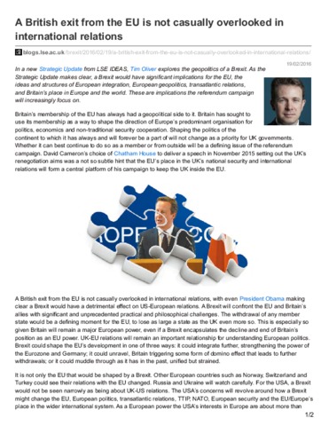 In a new Strategic Update from LSE IDEAS, Tim Oliver explores the geopolitics of a Brexit. As the Strategic Update makes clear, a Brexit would have significant implications for the EU, the ideas and structures of European integration, European geopolitics, transatlantic relations, and Britain’s place in Europe and the world. These are implications the referendum campaign will increasingly focus on.